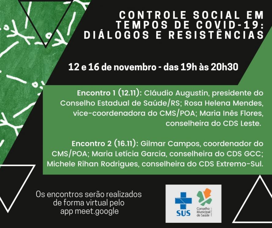O Conselho Municipal de saúde (CMS/POA) realiza nesta quinta-feira, 12, às 19 horas, o primeiro encontro “Controle Social em Tempos de Covid-19: Diálogos e Resistências”.