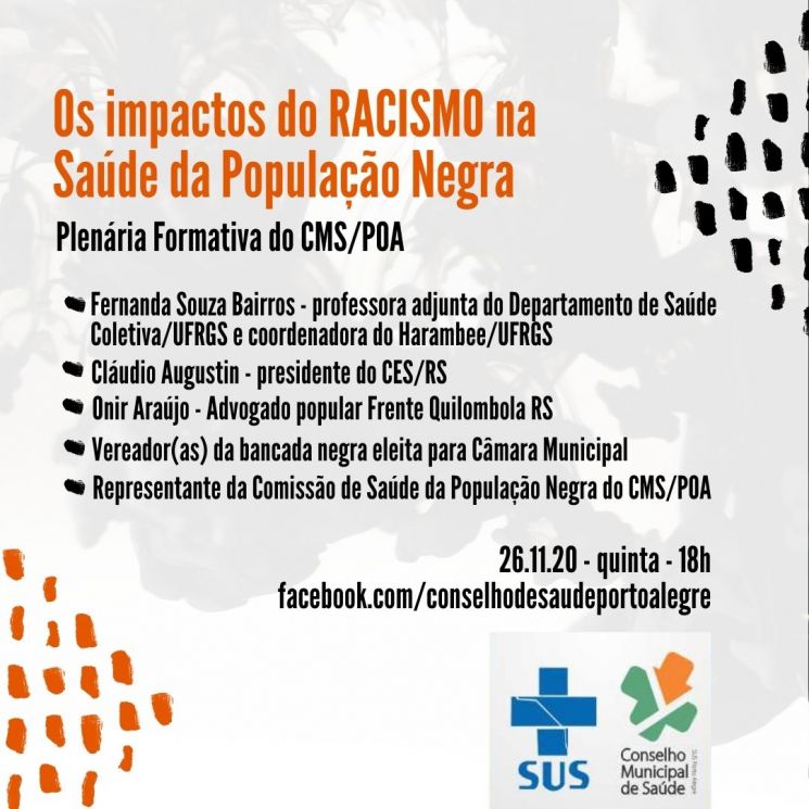 Impactos do Racismo na Saúde da População Negra será o tema da plenária formativa do Conselho Municipal de Sáude (CMS/POA) nesta quinta-feira, 26/11, às 18h, transmitida ao vivo na página facebook.com/conselhodesaudeportoalegre.