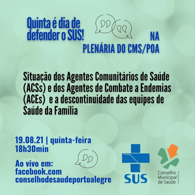 O Conselho Municipal de Saúde de Porto Alegre (CMS/POA) vai debater nesta quinta-feira, 19, sobre a situação dos Agentes Comunitários de Saúde (ACSs) e dos Agentes de Combate a Endemias (ACEs) e a descontinuidade das equipes de Saúde da Família em Porto Alegre.
