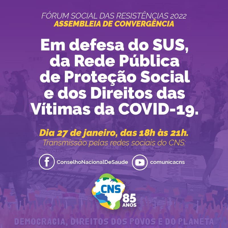 Integrando a programação do Fórum Social das Resistências 2022, o Conselho Nacional de Saúde (CNS) e entidades vão realizar no dia 27 de janeiro, às 18h, a Assembleia de convergência: “Em defesa do SUS, da Rede Pública de Proteção Social e dos Direitos das Vítimas da COVID-19”. A transmissão será pelo Facebook e Youtube do CNS, o link da transmissão será compartilhado também na página do CMS (https://www.facebook.com/conselhodesaudeportoalegre).