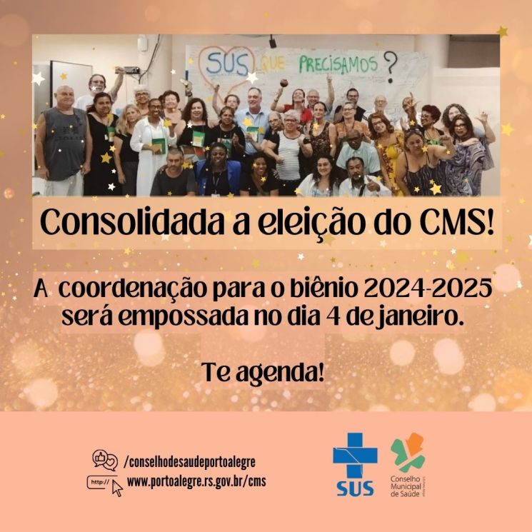 Conforme o calendário eleitoral, esta segunda-feira, 26, estava marcada como a data para a divulgação do resultado final das eleições para a coordenação do Conselho Municipal de Saúde de Porto Alegre no biênio 2024-2025. Como não houve recursos, nem pedido de impugnação relativa ao processo de votação ou ao processo de apuração dos votos do pleito realizado no dia 21, quinta-feira, a chapa eleita na última plenária do ano do CMS está consolidada.