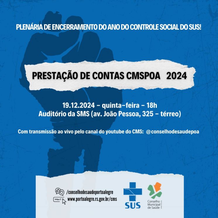 A primeira parte da reunião, da prestação de contas, será transmitida ao vivo pelo canal do youtube do CMS (@conselhodesaudepoa).