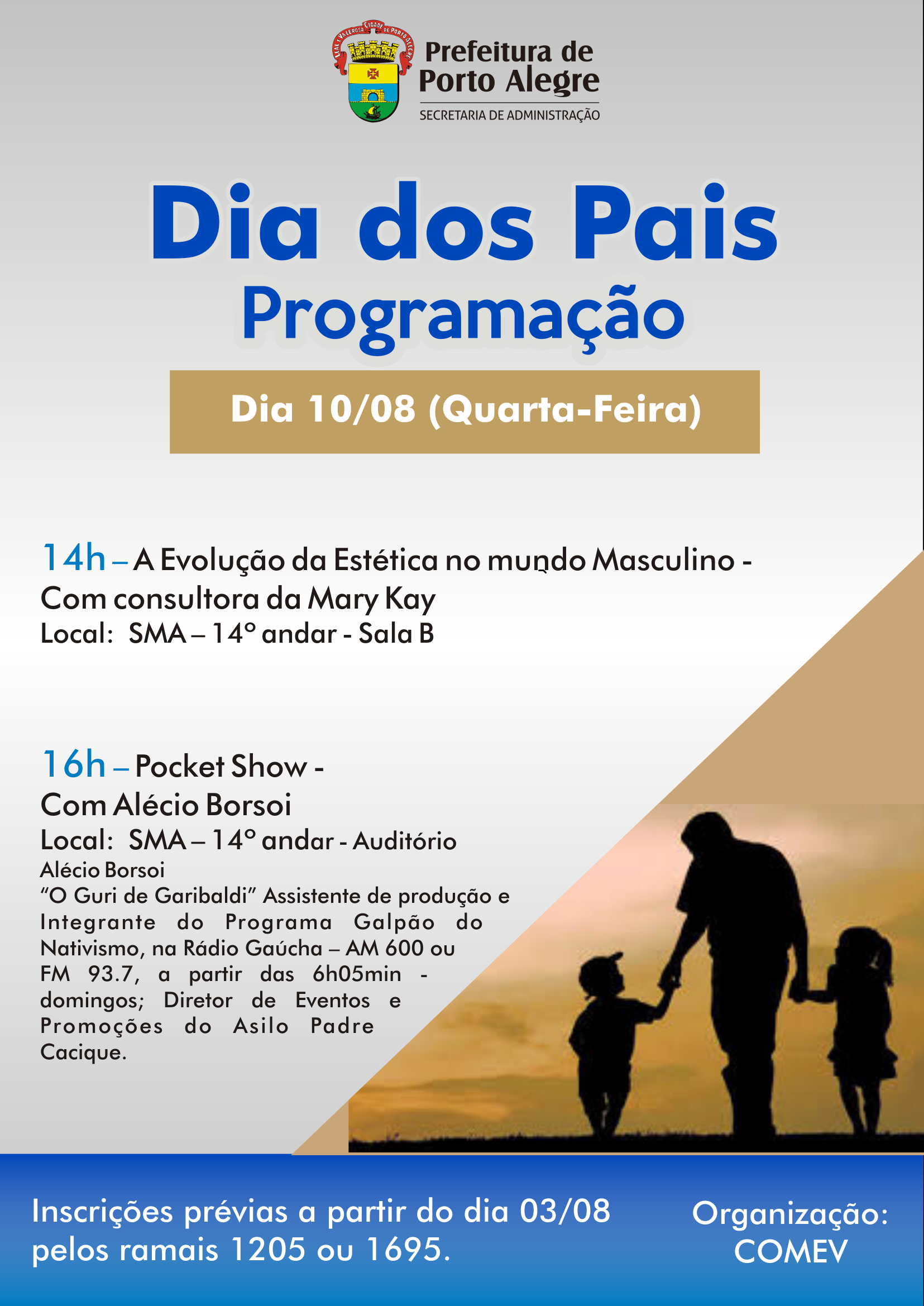 Comissão Municipal de Eventos (Comev) da Prefeitura de Porto Alegre convida para a programação em homenagem aos pais que acontece na próxima quarta-feira, 10, na sede da Secretaria Municipal de Administração (SMA).