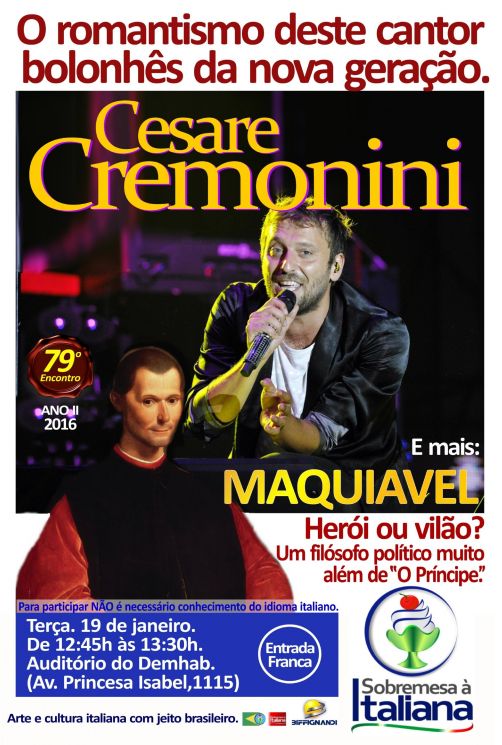 Nesta terça, 19 de janeiro: Conheça a história de um famoso e controvertido personagem da história mundial. O italiano Niccolò Machiavelli, ou, simplesmente, Maquiavel. Nascido em Florença, não foi apenas o diplomata do Renascimento, reconhecido como fundador do pensamento e da ciência política moderna. Ele foi historiador, poeta e também músico. Nesta edição do Sobremesa Italiana, saiba tudo sobre o pensador que revolucionou a forma de ver a política durante o governo dos "medici" e que, a partir de sua experiência, retirou alguns postulados para sua obra. E mais: Na sequência do encontro, o romantismo de Cesare Cremonini, o músico italiano da nova geração.