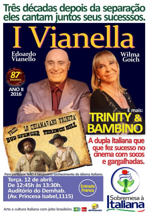 Em cartaz: Relembre a famosa dupla Terence Hill e Bud Spencer, que marcou época no cinema com os filmes da série Trinity. Com muito bom humor e ação, estes italianos levaram muita alegria com filmes como Deus Perdoa... Eu Não! (1967), Trinity é o Meu Nome (1970) e Dois Missionários do Barulho (1974). Logo após, conheça a trajetória de outra dupla, I Vianella, que fez sucesso na Itália cantando em dialeto Romanesco.