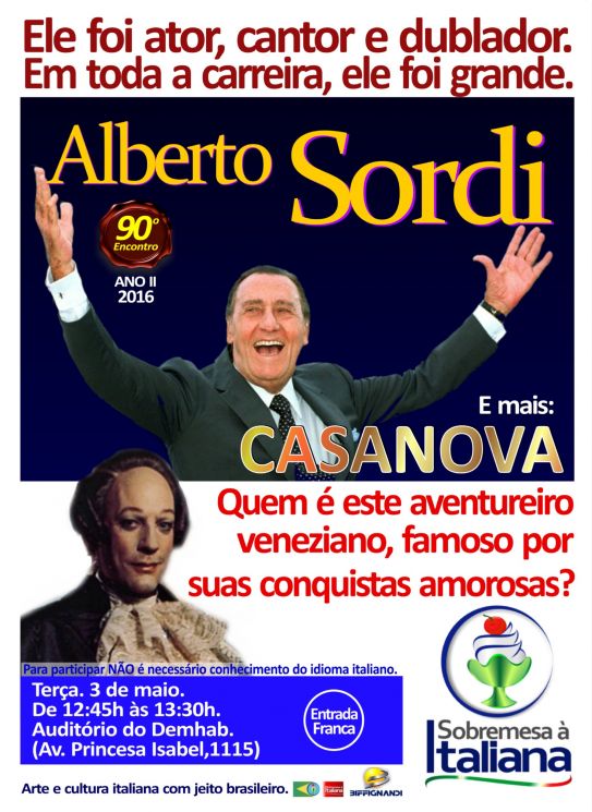 Em cartaz: Nesta edição, os participantes conhecerão tudo sobre a vida de Giacomo Girolamo, ou, simplesmente, Casanova, um renomado pergonagem italiano. Escritor e aventureiro, interrompeu a vida eclesiástica, preferindo viver uma série de conquistas amorosas. Na sequência, relembre a trajetória do ator, diretor e roteirista de cinema Alberto Sordi, que iniciou sua carreira aos 19 anos de idade, como dublador do comediante Oliver Hardy, da dupla o Gordo e o Magro.