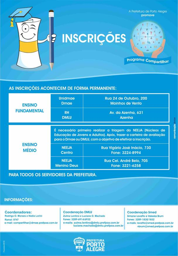 O Programa Compartilhar existe há mais de 20 anos e já formou centenas de alunos, inclusive no nível Superior. As inscrições, que ocorrem de forma permanente, podem ser feitas na Universidade Corporativa do Dmae (UniDmae) ou no DMLU da Azenha.