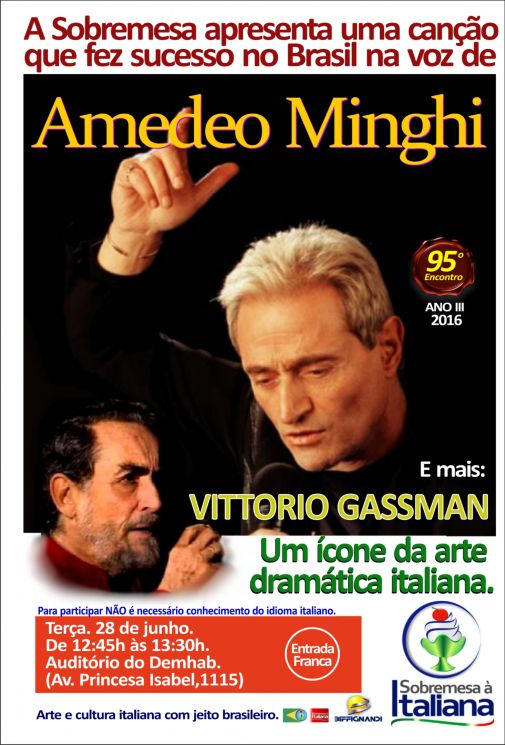 Em cartaz: A 95ª edição apresenta tudo sobre a vida do ator e dramaturgo italiano Vittorio Gassman, genovês, ,uito lembrado pelo seu profissionalismo, versatilidade e magnetismo. Sua carreira abrange produções importantes que lhe renderam grande popularidade. Logo após, haverá a apresentação e tradução de uma canção do cantor Amedeo Minghi, que fez muito sucesso no Brasil.