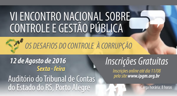 O Instituto de Pesquisa Gianelli Martins (IPGM) e o Tribunal de Contas do Estado (TCE-RS) promovem o VI Encontro Nacional Sobre Controle e Gestão Pública em 12 de agosto (sexta-feira), a partir das 9h, no auditório do TCE (rua Sete de Setembro, 388).